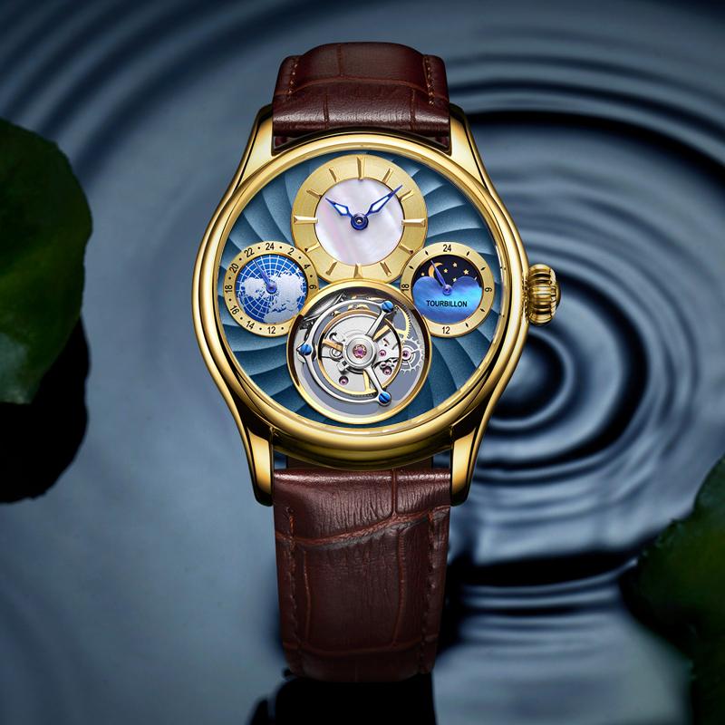 陀飞轮手动机械表,日月星辰+24小时显示功能,贝母盘